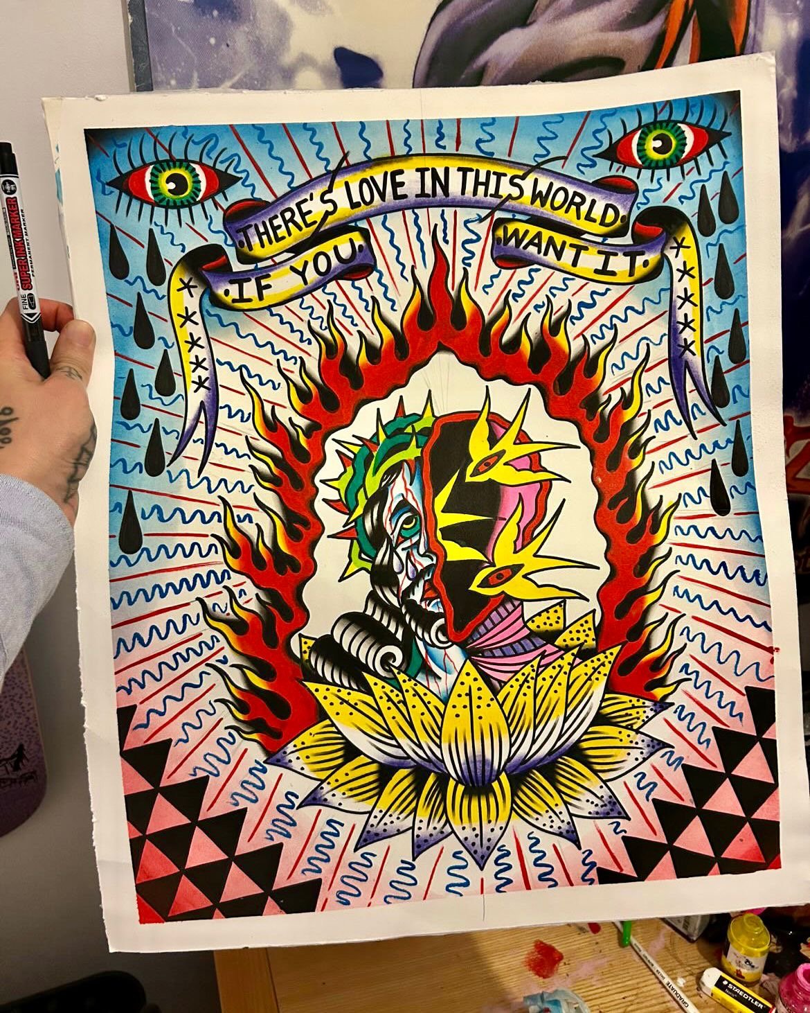 Original painting by Jimmy Wizard of Higher Power for the tour LP cover of their new record “There’s Love In This World If You Want It”.